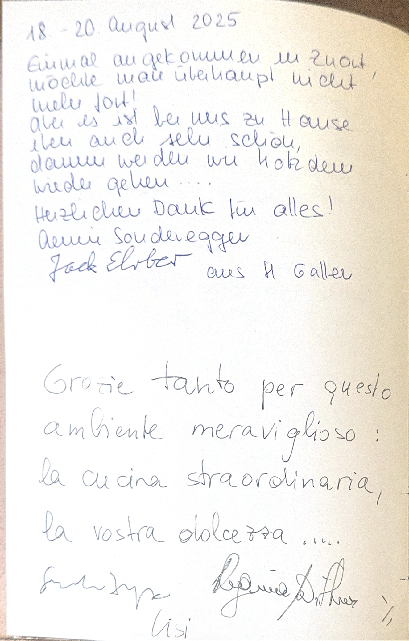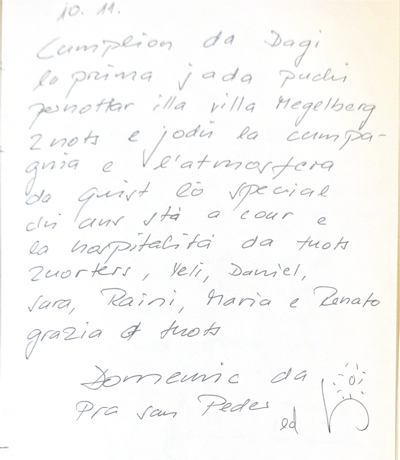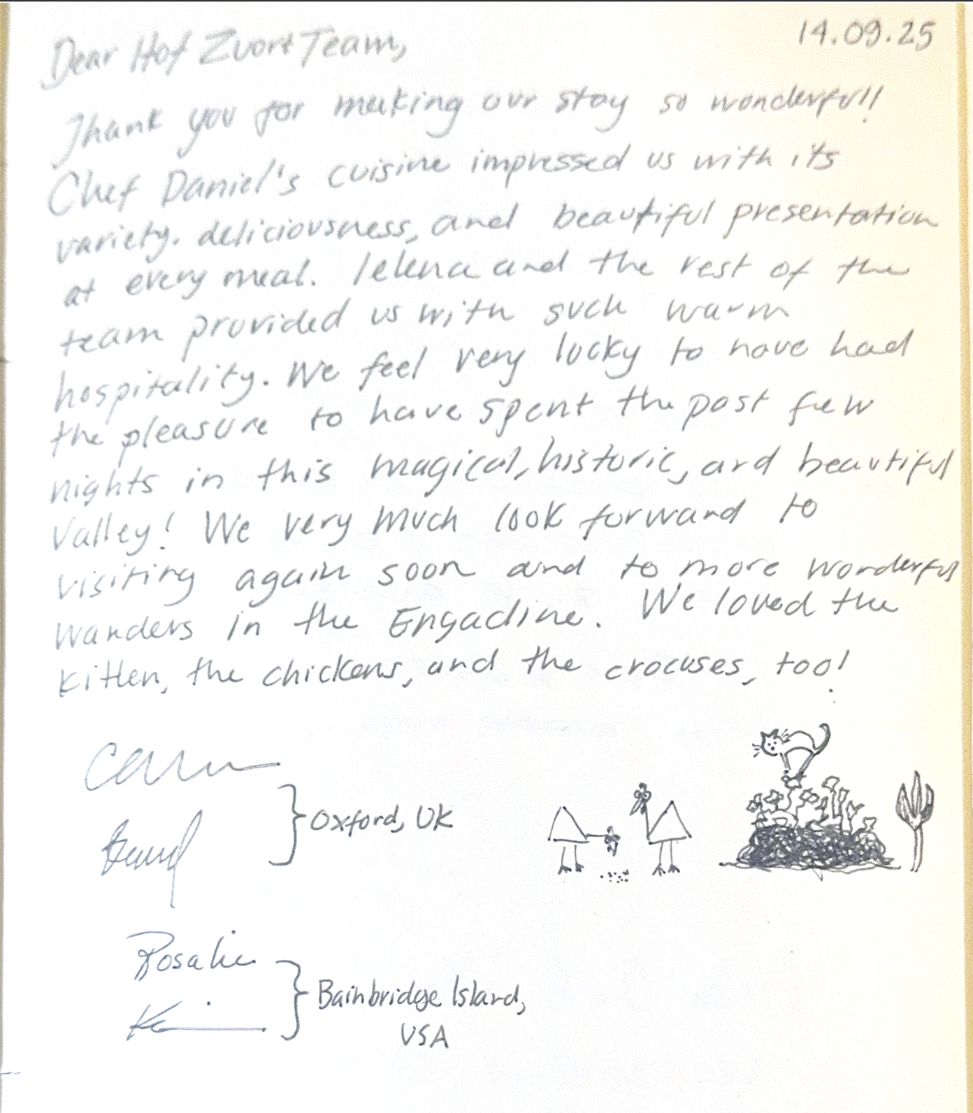 “The hour spent on the balcony of the Chasa two summers ago with two of my children and a bottle of white wine will linger in my memory as long as I live a an absolute Sternstunde. I would like to return with a third and my new son-in-law on their honeymoon next September. Vivat Chasa!”