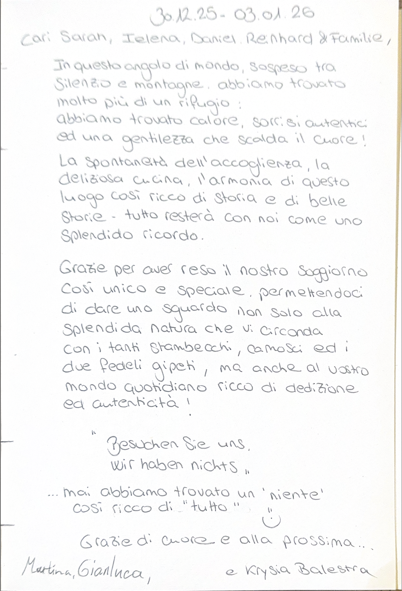 “Aventures alpines et lapines, paques 2021. Merci à toute l’équipe du Zuort Hof. C’était si bon! ... excellent, bel endroit, très joli chien. Je reviens très vite pour le suite avec balcon et jacuzzi.”